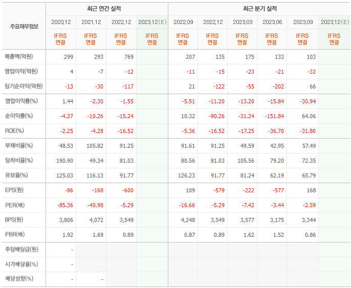 2022년 매출은 769억, 영업이익은 -12억, 당기순이익은 -117억입니다. 그리고 영업이익률은 -1.55%입니다.