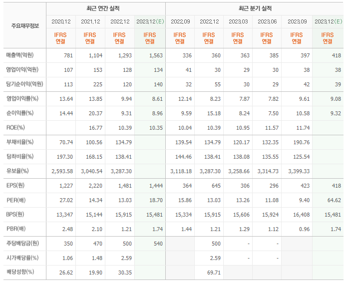 2022년 매출은 1293억, 영업이익은 128억, 당기순이익은 120억입니다. 그리고 영업이익률은 9.94%입니다.