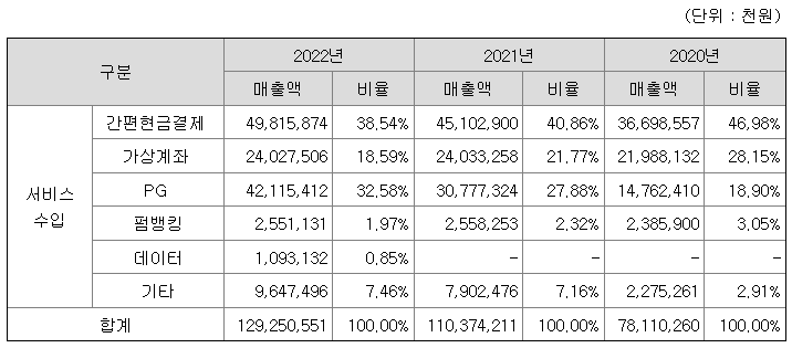 당사는 가상계좌서비스를 기반으로 출범하여 20여년간 안정적인 금융서비스를제공하여 왔으며, 빠르게 변화하는 핀테크 시장에 대응하고 고객의 다양한 Needs에 부응하기 위하여 간편현금결제, 가상계좌, PG, 펌뱅킹, 휴대폰결제, 지자체특화서비스 등통합 전자금융서비스를 제공하고 있으며, 보안, 편의성, 효율성을 검증받아 제휴사를대상으로 결제서비스/플랫폼을 제공하고 있습니다. 당사가 제공 중인 금융서비스는 다음과 같습니다.