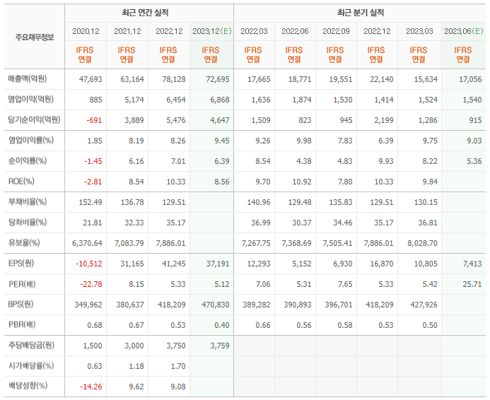 2022년 실적은 7조 8128억, 영업이익은 6454억입니다. 그리고 영업이익률은 8.26%입니다.