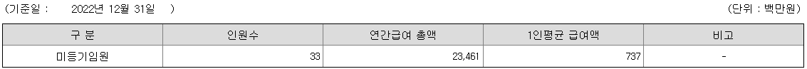 미등기임원의 평균연봉은 7억 3700만원이고 직원수는 33명입니다.