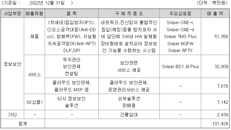 당사와 연결종속회사(이하 연결실체)는 네트워크보안 제품 제조 및 보안서비스 제공 등 정보보안부문이 전체 매출의 90% 이상 차지하는 관계로 연결실체별 별도의 사업의 내용은 작성하지 않습니다.
