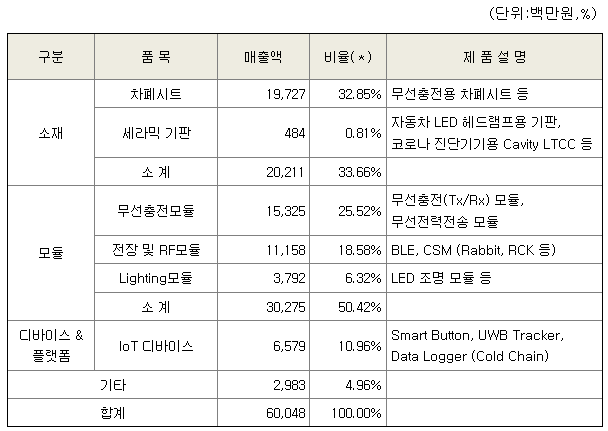 상기 사업영역 중 현재 매출 비중이 큰 주요 제품은 소재부문의 무선충전 차폐시트, 모듈 부문의 무선충전(Tx/Rx) 모듈, 전장 및 RF모듈 그리고 디바이스 & 플랫폼의 IoT 디바이스 등입니다. 이들 제품은 2022년 현재 당사의 전체 매출 중 약 80% 이상을 차지하고 있습니다.