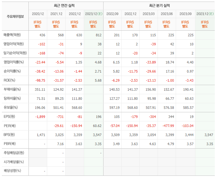 2022년 매출은 630억, 영업이익은 9억, 당기순이익은 -9억입니다. 그리고 영업이익률은 1.35%입니다.