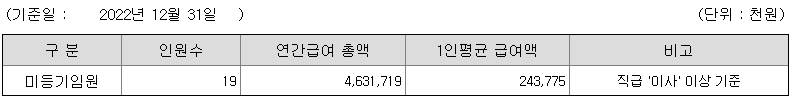 미등기임원의 평균연봉은 2억 4300만원이고 직원수는 19명입니다.