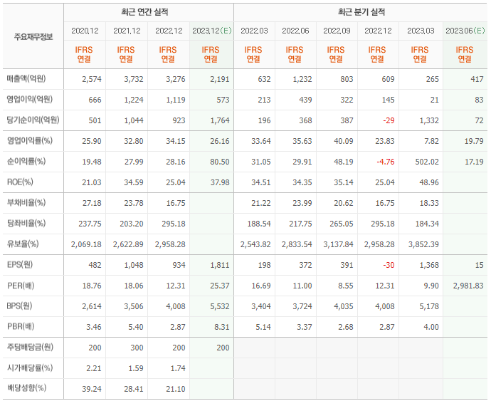 2022년 실적은 3276억, 영업이익은 1119억입니다. 그리고 영업이익률은 34.15%입니다.