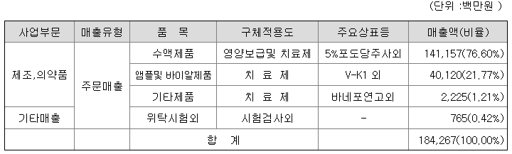 당사는 병,의원에서 필요로 하는 기초의약품인 수액제와 앰플제, 환자들의 비경구 영양보충을 위한 영양수액제 등을 주로 생산 판매하고 있으며 일반소비자들이 손쉽게 접근할 수 있는 OTC부문에서도 렌즈세척액, 다용도 세척을 위한 염화나트륨액등을 통해 약국시장에서도 그 영역을 확대하고 있습니다. 아울러 동남아국가를 위시한 수출에서도 가시적 성과창출을 위해 부단히 노력하고 있습니다. 2022년도 당기 매출액은 1,842억원이며 영업이익 및 순이익은 329억원과 249억원을 기록하였습니다.