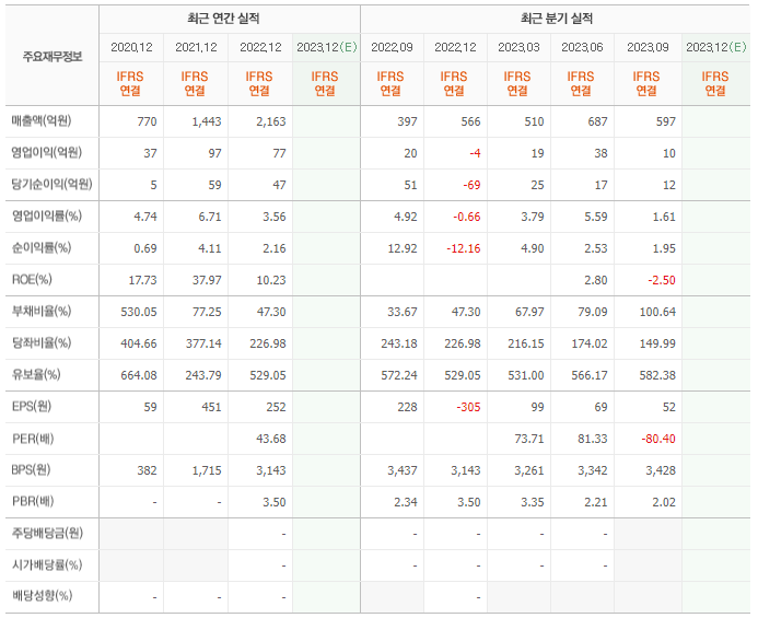 2022년 매출은 2163억, 영업이익은 77억, 당기순이익은 47억입니다. 그리고 영업이익률은 3.56%입니다.