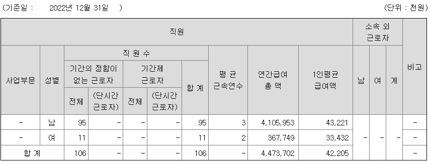 미등기임원의 평균연봉은 1억 1000만원이고 직원수는 2명입니다.