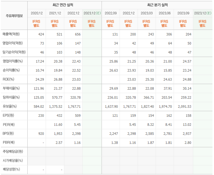 2022년 매출은 656억, 영업이익은 147억, 당기순이익은 148억입니다. 그리고 영업이익률은 22.43%입니다.