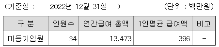 미등기임원의 평균연봉은 3억 9600만원이고 직원수는 34명입니다.