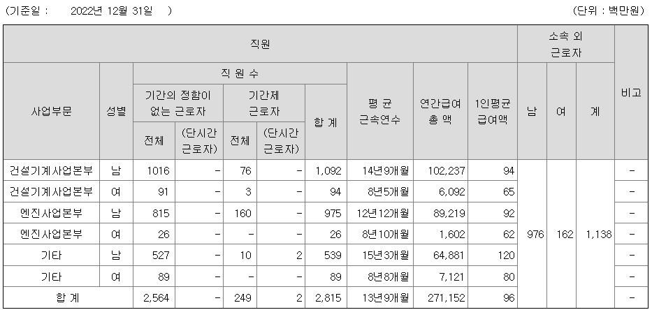 HD현대인프라코어 연봉 2022년 기준 공시자료