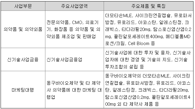 의약품 및 의약외품 사업을 영위하고 있는 당사는 2022년 연간 누계 1,944억원의 매출을 달성하며 전년동기 대비 25.3% 성장을 보이고 있습니다. 당사는 품질경쟁우위 확보 및 제품 수익군 관리를 통하여 지속적으로 사업경쟁력을 강화하겠습니다. 사업의 자세한 내용은 하단에 계속됩니다.