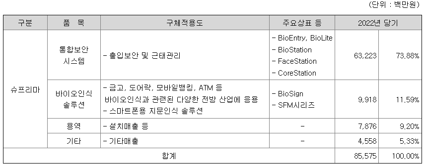 통합보안 시스템 사업은 얼굴, 지문 등 바이오인식 기술, 모바일,RF 등 비접촉 기술에 기반한 출입보안 및 근태관리시스템을 공급하고 있으며, 바이오인식 솔루션 사업은 스마트폰용 지문인식 알고리즘(BioSign)과 바이오인식 모듈(SFM) 공급에 주력하고 있습니다.