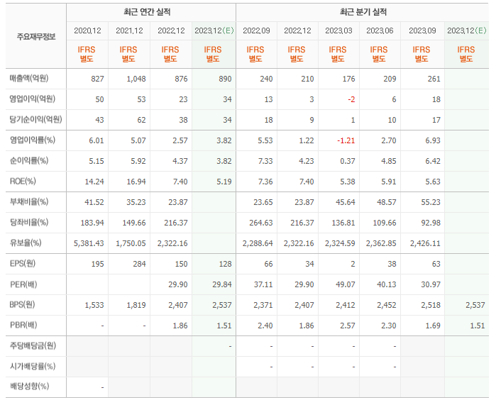 2022년 매출은 876억, 영업이익은 23억, 당기순이익은 38억입니다. 그리고 영업이익률은 2.57%입니다.