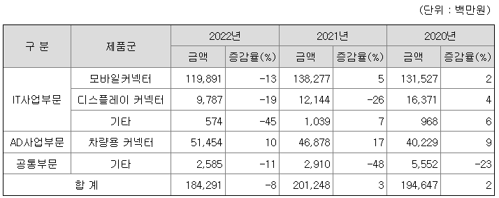 IT 사업부문은 Mobile, Display용 초정밀 커넥터를 생산 및 판매하며, AD사업부문은차량용 커넥터를 생산 및 판매하고 있습니다.