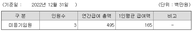 미등기임원의 평균연봉은 1억 6500만원이고 직원수는 3명입니다.