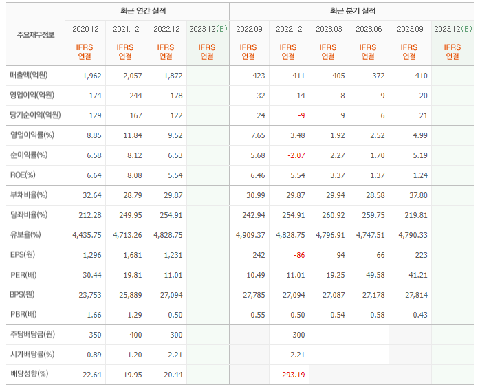2022년 매출은 1872억, 영업이익은 178억, 당기순이익은 122억입니다. 그리고 영업이익률은 9.52%입니다.