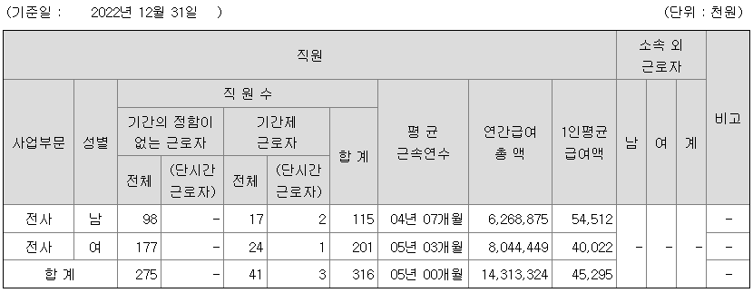 남성의 평균연봉은 5451만원이고 직원수는 115명, 여성은 4002만원이고 직원수는 201명입니다. 전체 평균연봉은 4529만원이고 직원수는 316명입니다.