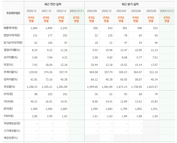 2022년 매출은 2242억, 영업이익은 252억, 당기순이익은 97억입니다. 그리고 영업이익률은 11.26%입니다.