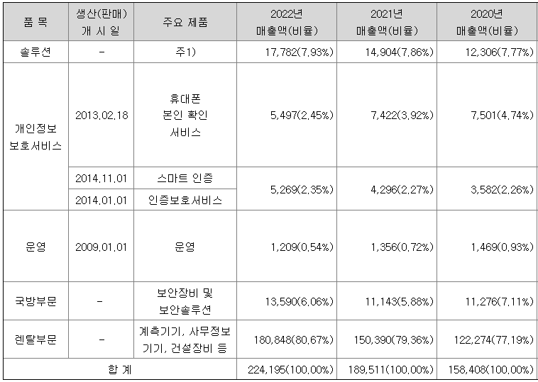 당사의 주요사업은 암호, 인증, 인식, 감시 등의 보안기술이 적용된 제품이나 서비스를 제공하는 정보보호산업에 속해있습니다. 당사는 자체 보유한 기술력 및 전문인력을 통해 행정, 공공기관, 금융기관, 일반업체 등 다양한 기관에 PKI/인증, 유선보안, 무선보안, 전자문서 보안 분야 등의 솔루션 공급 및 SI 사업을 수행하고 있습니다.