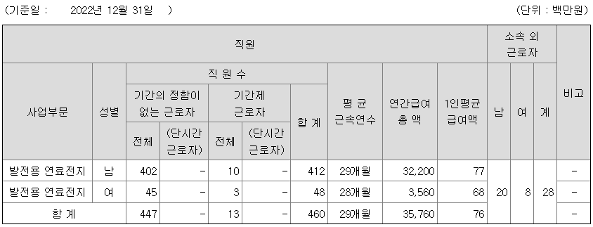 두산퓨얼셀 연봉 2022년 기준 공시자료