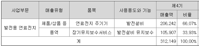 당사의 핵심 사업은 발전용 연료전지 사업으로, 발전용 연료전지 기자재 공급 및 연료전지 발전소에 대한 장기유지보수서비스 제공을 주요 사업으로 영위하고 있습니다. 매출 비중은 2022년 사업연도를 기준으로 기자재 공급 66% 및 장기유지보수서비스 34%로 구성되어 있으며, 주요 고객사는 공공 및 민간 발전사업자입니다. 당사가 제작ㆍ공급하는 연료전지는 전기 및 열효율을 포함하는 복합효율이 높고 안정성이 우수하며 분산 발전이 가능한 친환경 발전원으로, 국내 발전용 연료전지 시장 누적점유율 1위를 기록하고 있습니다.