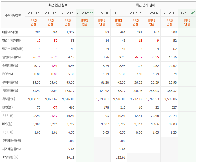 2022년 매출은 1329억, 영업이익은 55억, 당기순이익은 93억입니다. 그리고 영업이익률은 4.17%입니다.