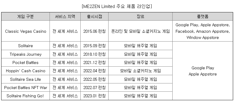 당사는 2012년 6월 소셜 카지노 시장에 진출하였으며, 2015년 6월 "Classic Vegas Casino"와 2015년 9월 "Double Hit Casino"를 출시하며 Google Play, Apple Appstore, Facebook 및 Amazon을 비롯한 다양한 플랫폼에서 25개 이상의 소셜카지노 게임을 서비스하고 있습니다. 또한 2015년 6월 당사는 소셜카지노 게임의 실적을 바탕으로 신규 시장 진출을 모색하였으며, 이의 일환으로 캐주얼 클래식 카드 게임인 "Solitaire"를 출시하였고 보고서 기준일 현재 10여개 이상의 Solitaire 게임을 서비스 하고 있습니다.