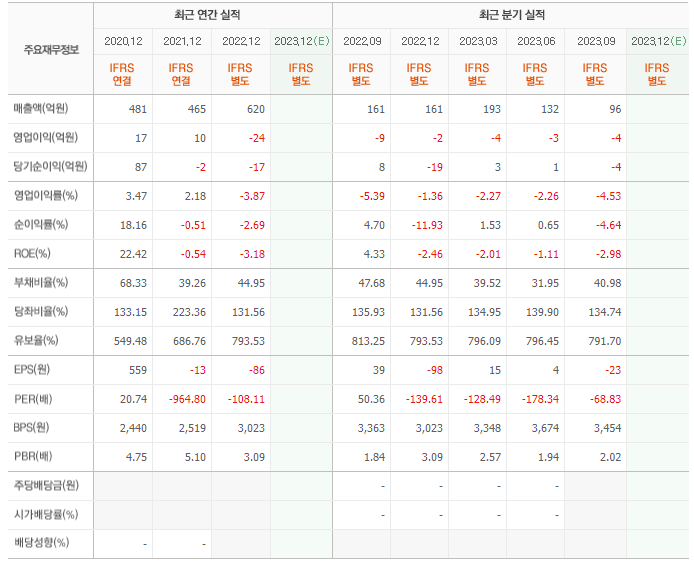 2022년 매출은 620억, 영업이익은 -24억, 당기순이익은 -17억입니다. 그리고 영업이익률은 -3.87%입니다.