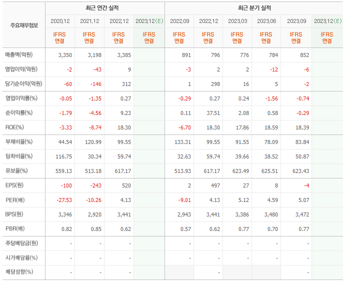 2022년 매출은 3385억, 영업이익은 9억, 당기순이익은 312억입니다. 그리고 영업이익률은 0.27%입니다.