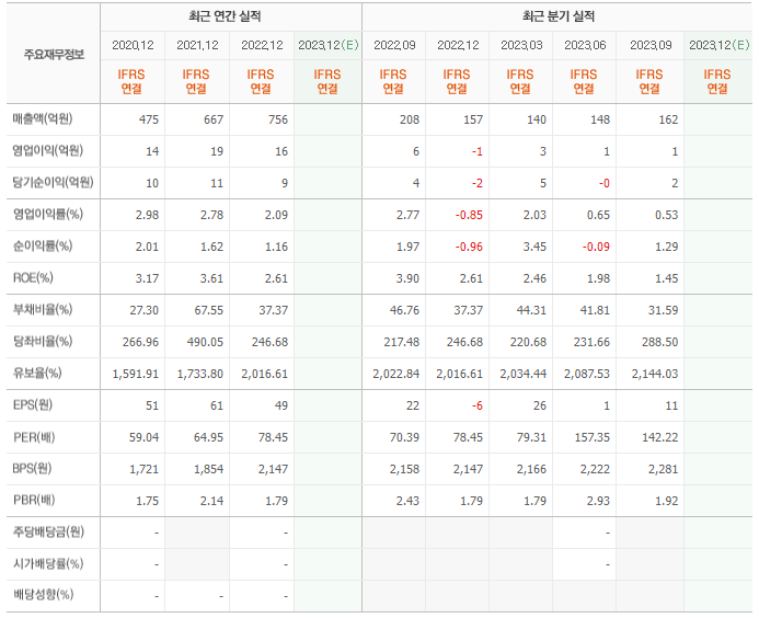 2022년 매출은 756억, 영업이익은 16억, 당기순이익은 9억입니다. 그리고 영업이익률은 2.09%입니다.