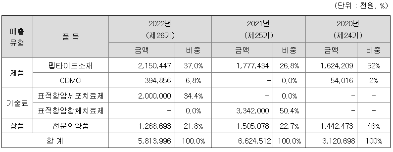 당사는 약효지속성 의약품의 개발과 함께 연구용 펩타이드 소재도 생산하고 있으며, 해당 판매액을 제품매출로 인식하고 있습니다. 또한, 고순도 '히알우로니다아제'를 주성분으로 하는 제품(제왕절개 수술을 받은 임산부의 부종을 조기억제)을 판매하는 의약품 도매업을 영위하고 있으며 해당 판매액을 상품매출로 인식하고 있습니다.