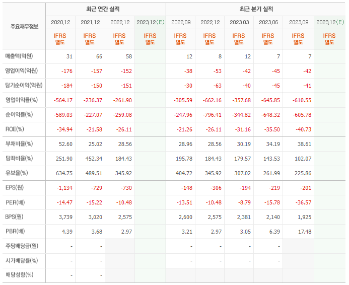 2022년 매출은 58억, 영업이익은 -152억, 당기순이익은 -151억입니다. 그리고 영업이익률은 -261.90%입니다.