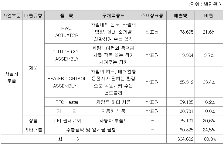 또한, 2022년부터 현대 및 기아자동차 등 국내 완성차와 유럽의 주요 완성차의 1차 납품업체로서 등록을 완료했고, 당사 PTC/COOLANT HEATER를 완성차업체에 직접 판매하고 있습니다.