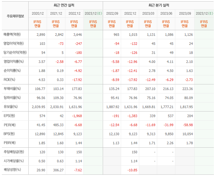 2022년 매출은 3646억, 영업이익은 -247억, 당기순이익은 -180억입니다. 그리고 영업이익률은 -6.77%입니다.
