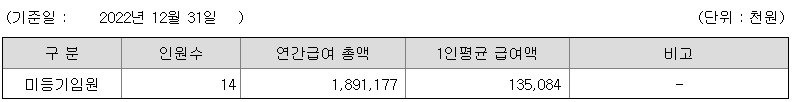 미등기임원의 평균연봉은 1억 3508만원이고 직원수는 14명입니다.
