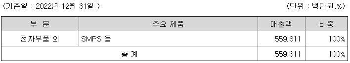 당사의 사업은 크게 휴대폰용 충전기와 디지털 가전용 SMPS, 기타 SMPS 로 구분되며, 최근 태양광인버터(PCS)등의 친환경제품 등의 제조 및 판매에도 최선을 다하며 빠르게 변화하는 시장에 신속히 대응하고자 노력하고 있습니다.