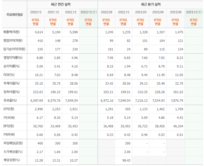 2022년 매출은 5598억, 영업이익은 278억, 당기순이익은 230억입니다. 그리고 영업이익률은 4.96%입니다.