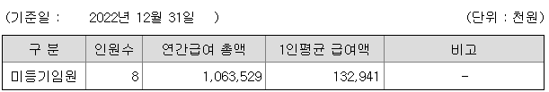 미등기임원의 평균연봉은 1억 3294만원이고 직원수는 8명입니다.