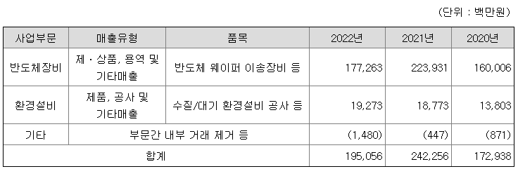 당사는 반도체장비 사업부문과 환경설비 사업부문으로 구성되어 있습니다. 반도체 장비의 주요 생산 품목은 Cluster Tool System, EFEM(Equipment Front End Module), LPM(Load Port Module)으로 구성되어 있으며, 환경설비 사업부문은 수질, 대기 환경설비 공사를 주로 진행하고 있습니다. 당기말 매출실적은 다음과 같습니다.