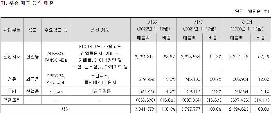 당사 및 해외종속회사의 사업은 제품 및 제조공정의 특징, 시장 및 판매방법의 특징 등에 따라 산업자재, 섬유 및 기타 부문으로 구분할 수 있습니다. 당사의 연결기준 2022년 매출액은 3,841,373백만원이며, 그 중 산업자재부문 매출액은 3,794,214백만원입니다. 산업자재 부문에는 타이어보강재, 산업용 원사, 카페트, 아라미드, 탄소섬유 등이 있습니다. 타이어보강재는 타이어제조에 필수적으로 사용되며, 대표제품으로 타이어코드와 스틸코드가 있습니다. 산업용 원사는 자동차용 Seat belt, 에어백, 건축, 토목 및 일반 산업현장 등에서 광범위하게 사용되고 있습니다.