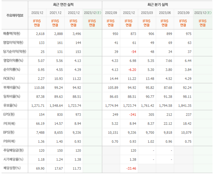 2022년 매출은 3496억, 영업이익은 144억, 당기순이익은 153억입니다. 그리고 영업이익률은 4.13%입니다.