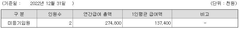 미등기임원의 평균연봉은 1억 3740만원이고 직원수는 2명입니다.