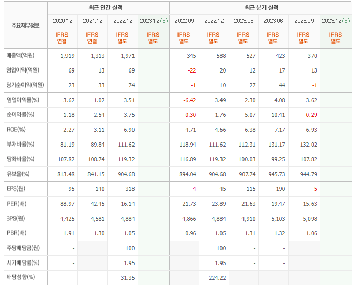 2022년 매출은 1971억, 영업이익은 69억, 당기순이익은 74억입니다. 그리고 영업이익률은 3.51%입니다.