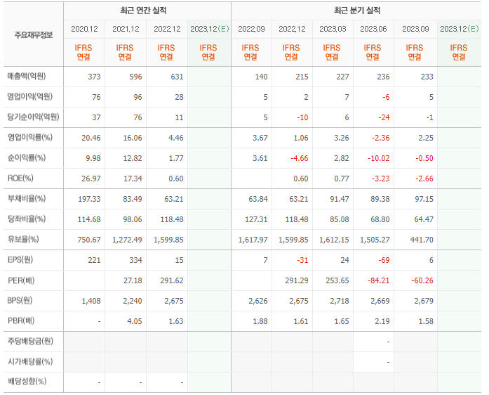 2022년 매출은 631억, 영업이익은 28억, 당기순이익은 11억입니다. 그리고 영업이익률은 4.46%입니다.