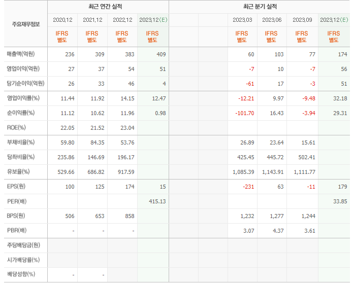 2022년 매출은 383억, 영업이익은 54억, 당기순이익은 46억입니다. 그리고 영업이익률은 14.15%입니다.