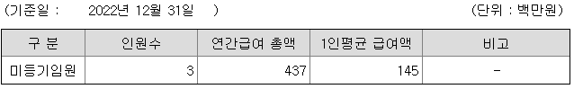 미등기임원의 평균연봉은 1억 4500만원이고 직원수는 3명입니다.