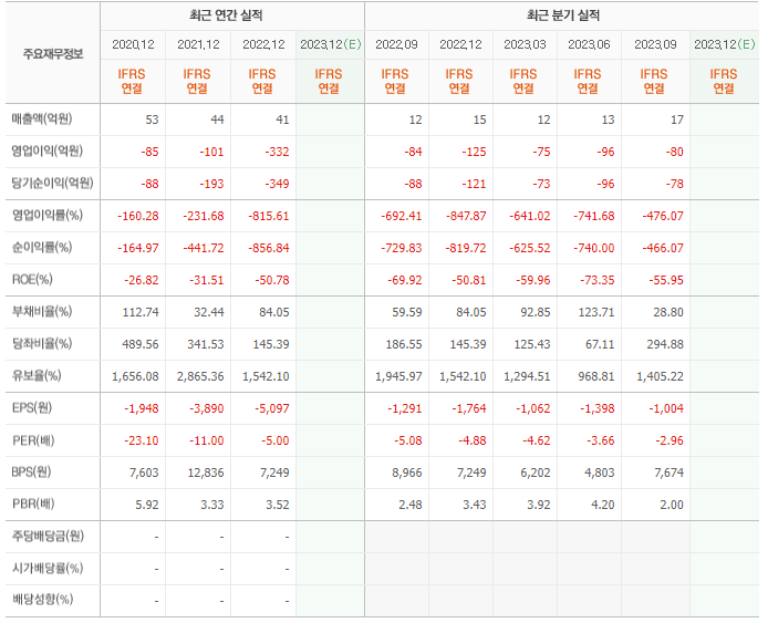 2022년 매출은 41억, 영업이익은 -332억, 당기순이익은 -349억입니다. 그리고 영업이익률은 -815.61%입니다.