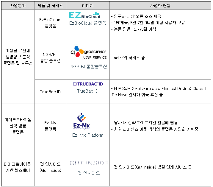 당사는 마이크로바이옴 빅데이터 플랫폼을 통한 마이크로바이옴 치료제 신약개발과 마이크로바이옴 생명정보 분석서비스 및 마이크로바이옴 기반 맞춤형 헬스케어 사업을 주요 사업으로 영위하고 있습니다. 기타 자세한 사항은 동 보고서의 'II. 사업의 내용'을 참고하시기 바랍니다.